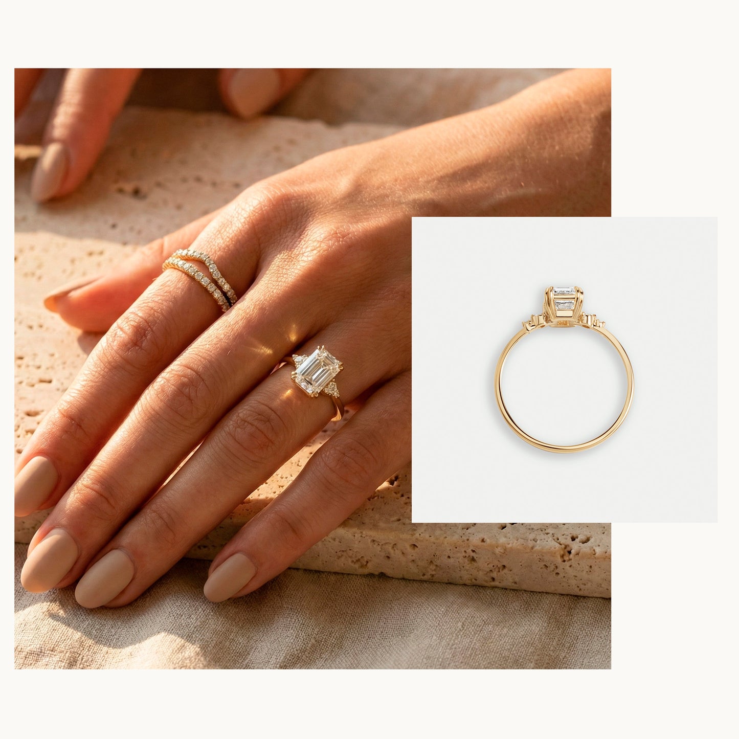 La banda, fina y elegante, presenta una transición suave gracias a sus 4 diamantes laterales graduados (dos a cada lado). Estas piedras crecen en tamaño a medida que se acercan al centro, guiando la mirada inevitablemente hacia el brillo principal.