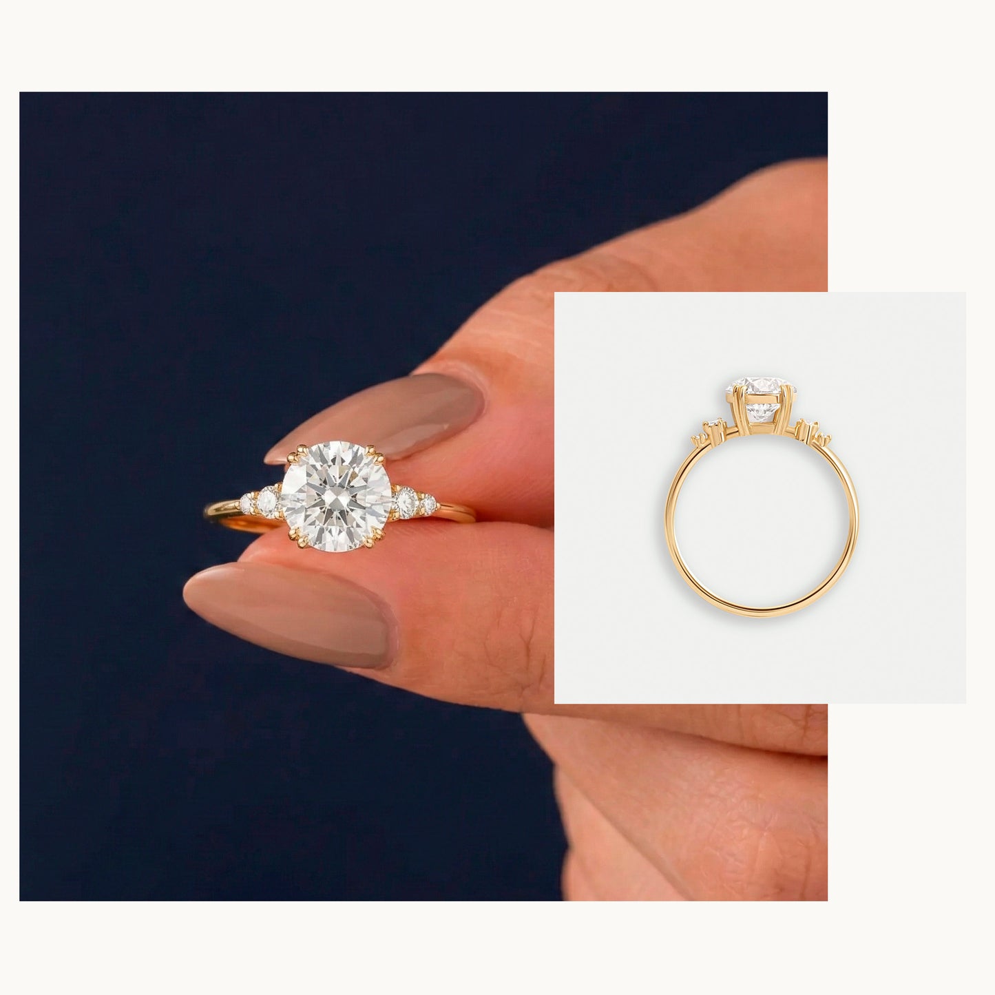 La banda, fina y elegante, presenta una transición suave gracias a sus 4 diamantes laterales graduados (dos a cada lado). Estas piedras crecen en tamaño a medida que se acercan al centro, guiando la mirada inevitablemente hacia el brillo principal.
