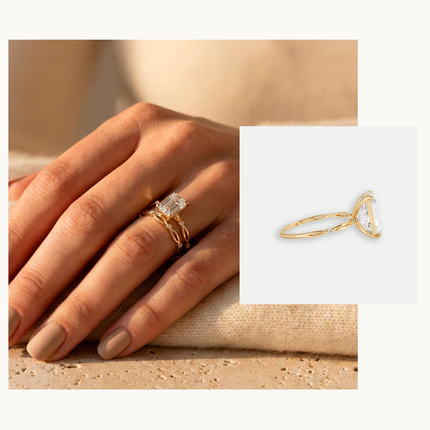 Su característica distintiva es la banda trenzada que juega con el espacio negativo, creando una sensación de ligereza visual sin sacrificar solidez. La banda se entrelaza suavemente hasta llegar a la corona, evocando las ramas que sostienen una flor.