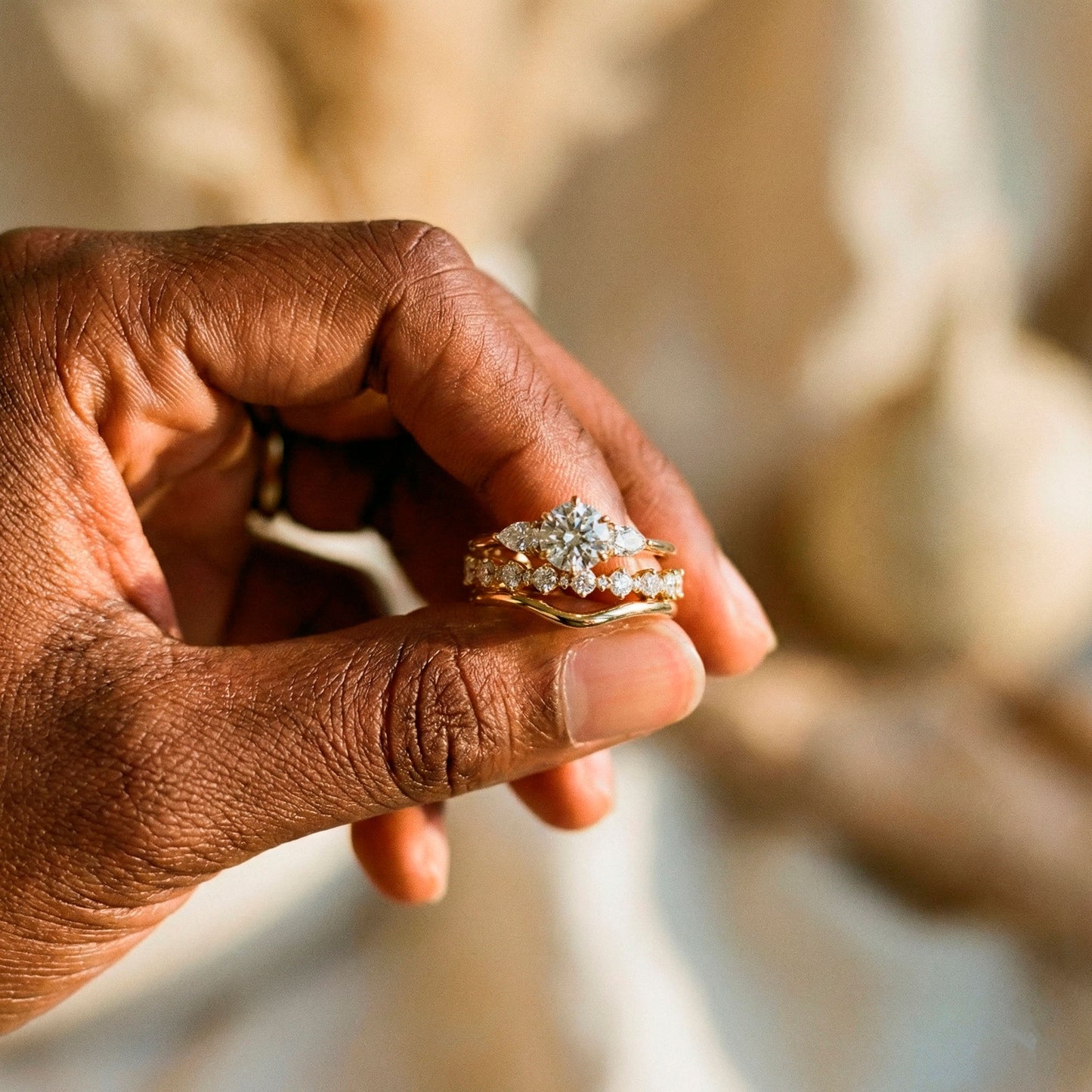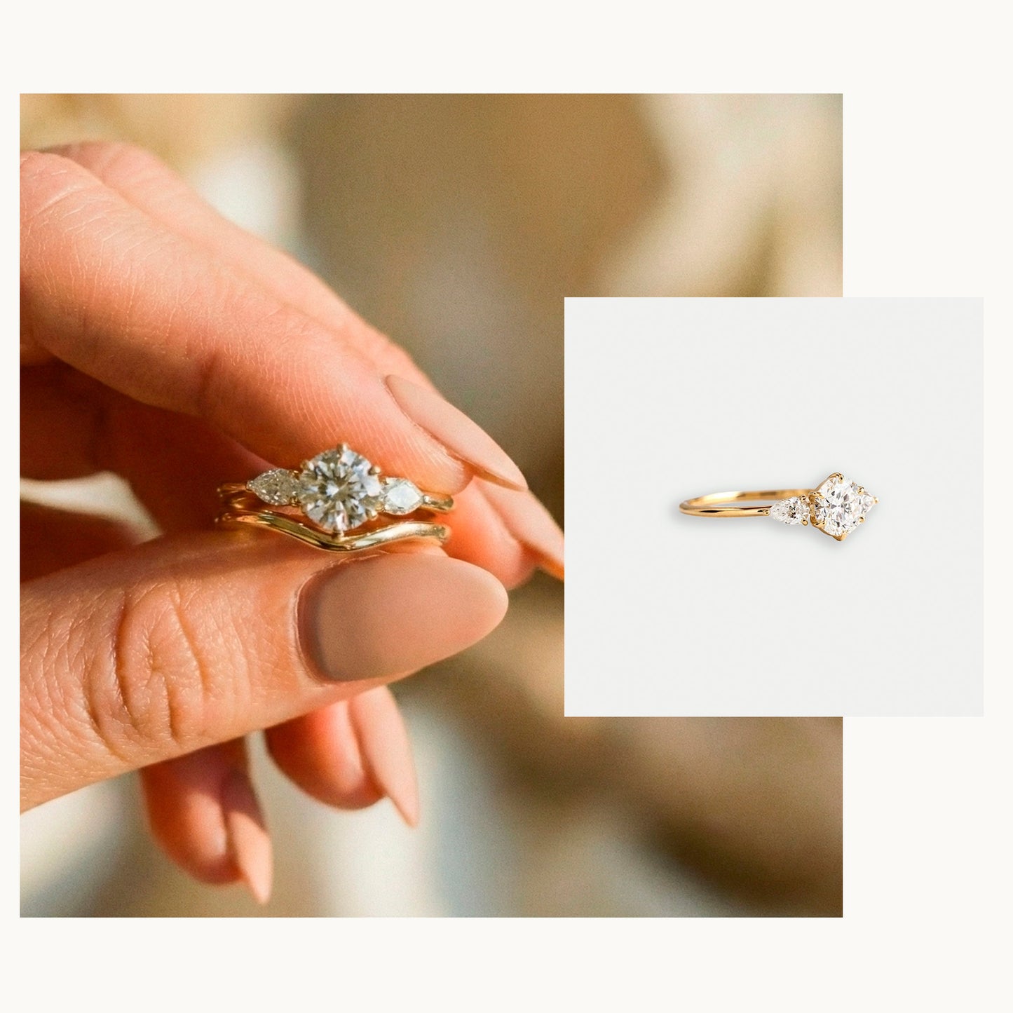 Hemos diseñado los engastes laterales ligeramente más bajos que el central. Este desnivel técnico crea una ilusión óptica donde los diamantes talla Pera parecen elevar la piedra principal hacia el cielo, guiando la mirada suavemente hacia el centro de la composición.